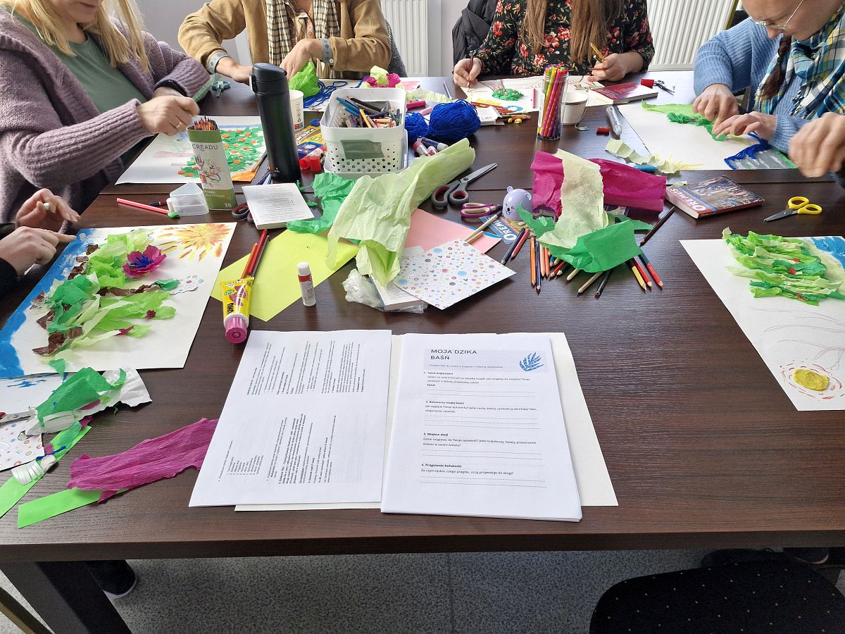 Warsztat był podróżą w głąb siebie. Poprzez tworzenie kolaży uczestniczki wyrażały swoje wewnętrzne doświadczenia – radości, tęsknoty, pragnienia i marzenia. Każda z nas miała też okazję stworzyć osobistą baśń o dzikiej kobiecie, opowiadając historię swojej siły, odwagi i wolności. Następnie odczytywałyśmy symboliczne przesłania swoich wizualnych opowieści, które pozwoliły dostrzec to, co w nas najgłębsze i najcenniejsze.