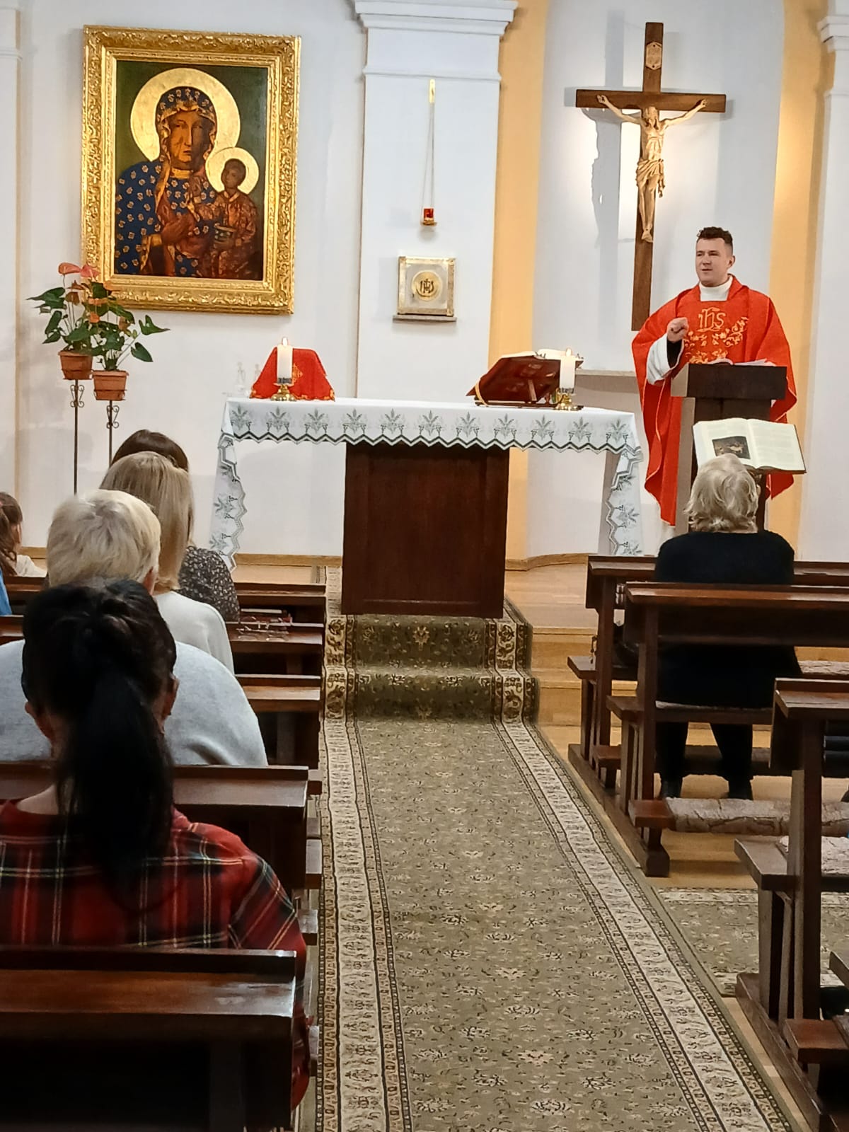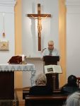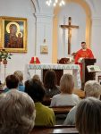 Modlitwa adoracyjna przygotowała nas do Eucharystii, którą celebrował Ksiądz Michał Kamiński. W swoim przedłożeniu przedstawił zebranym życiorys i misję jaką wypełniła w narodzie wybranym Tamar. Otóż spotykamy ją na początku Ewangelii św. Mateusza w rodowodzie Jezusa jako jedną z pięciu kobiet wśród licznych imion męskich. Zatem, kobieta ta – jako przodkini Chrystusa – miała istotne miejsce w Bożej wizji dziejów. Była Kananejką, jedyną synową Judy, który miał trzech synów. Pierwszy jak i drugi syn Judy nie zapewnił potomstwa. Tamar w obu małżeństwach doznała krzywd. Do tych nieszczęść dokłada się sam teść Juda postępując nieuczciwie wobec Tamar a także wbrew obowiązkowi lewiratu bojąc się stracić trzeciego syna, i odsyła ją do jej rodziny. Wiedziała jednak, że wdowy nie miały żadnych praw do dziedziczenia. Mocno zraniona i oszukana przez mężczyzn zdecydowała się na podstęp. Przebierając się na nierządnicę, współżyła z owdowiałym już wówczas Judą, swoim teściem. Za sprawą tego zaszła w ciążę. Nowina ta wywołała skandal w rodzinie Judy, a ten kazał ją spalić. Ale Tamar dobrze wiedziała, że nic jej nie grozi – miała bowiem solidne argumenty w postaci insygniów Judy, zabranych mu podczas pamiętnego spotkania. Gdy Tamar to ujawniła sam Juda zareagował: „Ona jest sprawiedliwsza od mnie, bo przecież nie chciałem jej dać memu synowi!” (Rdz 38, 26). Jego słowa obrazują więc, że postępowanie Tamar – choć pozornie nie do końca wydaje nam się czyste i słuszne – było w tej sytuacji właściwe. Kobieta ocaliła swoje imię przed niesławą bezdzietności i samotnością. Zapewniła sobie i swojemu potomstwu miejsce w umiłowanym przez Boga narodzie. Dane jej było zaznać uciechy z macierzyństwa podwójnie – urodziła bowiem bliźnięta.